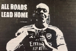 随后在周三深夜,由艺术家“北班克西”创作的埃泽壁画悄然出现在酋长球场外的隧道墙壁上,画面中身着阿森纳球衣的埃泽正在做出其标志性庆祝动作。